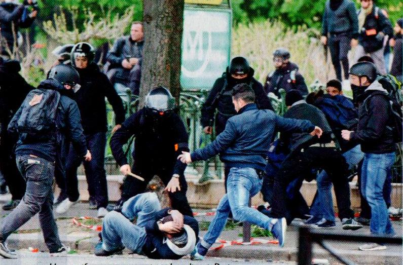Tweehonderd autonomen, ‘casseurs’, onherkenbaar onder helmen en vermommingen, uitgerust met houten schilden en ijzeren staven, ‘enragés’ door de gedachte om erop los te gaan. Op minder dan 50 meter krijgen de flics een waar bombardement aan stenen, flessen, stokken over zich heen. Twee CRS-flics snellen toe om de gewonde hulp te verlenen, terwijl een geïmproviseerde bom (gevuld met spijkers en schroeven) op enkele meters van hen explodeert, waarbij het helmvizier van één van hen wordt vernield.